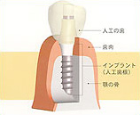 インプラント治療は、失った歯の代わりに顎の骨に人工歯根を埋め込み、その上に上部構造(人工の歯)を装着して咬み合わせを回復する治療法です。人工歯根の素材に用いられるチタンは金属でありながら人体になじみやすく、金属アレルギーの心配もありません。これまでと違和感のない天然歯と同じような歯を取り戻せるのです。